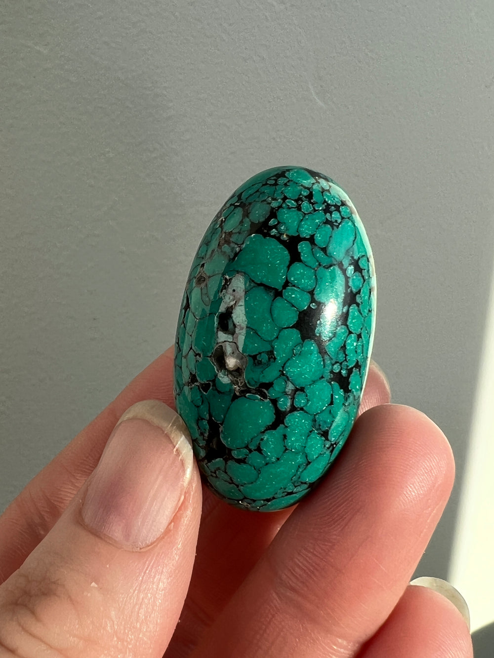 Tibetan Turquoise, a revered gemstone with deep cultural and spiritual significance, is known for its unique, vibrant blue and green hues, often interlaced with natural, earthy matrix patterns. Mined in the Himalayan regions of Tibet, this variety of Turquoise is esteemed for its ancient heritage and exquisite beauty. Unlike other Turquoise, Tibetan Turquoise often presents a more rustic, unrefined look, adding to its mystical charm. In Tibetan culture, it symbolizes sky and water, representing wisdom, tranquility, and protection. It is often used in traditional jewelry and spiritual practices, believed to promote healing, enhance communication, and offer protection. The rich, historical significance and stunning natural beauty of Tibetan Turquoise make it a cherished stone for collectors, jewelry makers, and those seeking a profound spiritual connection.